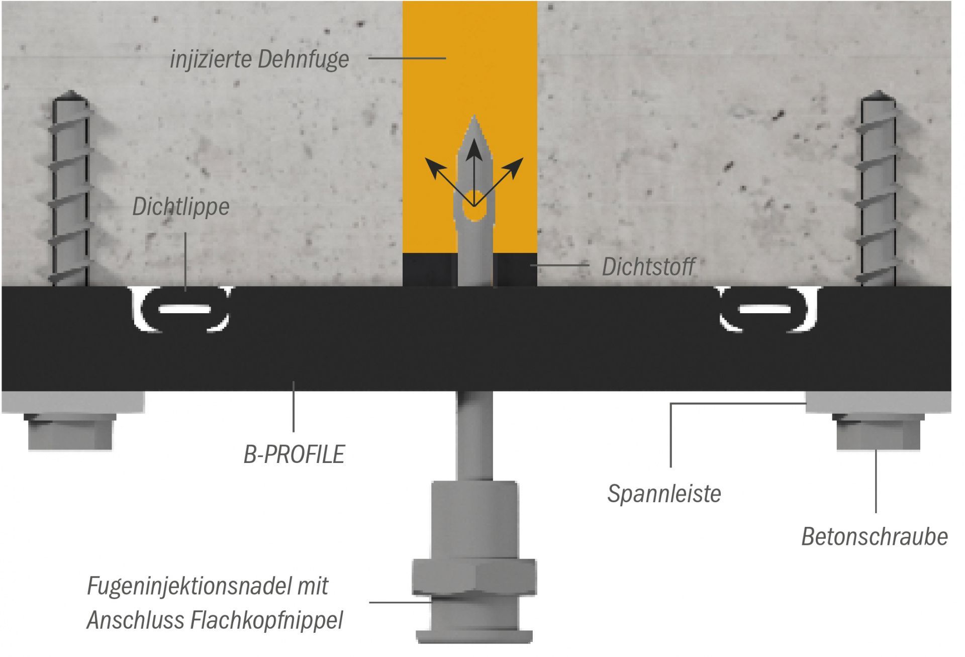 Das feste Material des B-PROFILE® umspannt die Fugeninjektionsnadel, dadurch wird diese gehalten und gleichzeitig abgedichtet. Die integrierten Dichtlippen des Fugengummis sorgen für einen undurchlässigen Anschluss an das Bauteil, das Gummi passt sich exakt den Unebenheiten an.