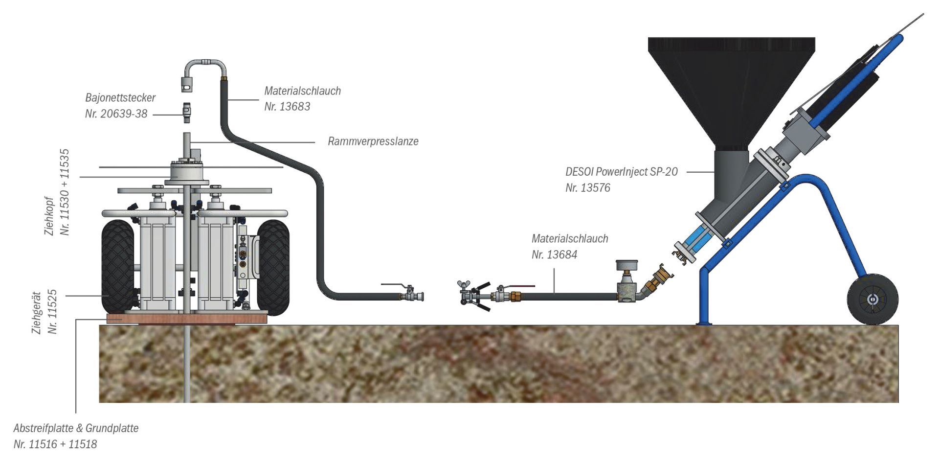 - Materialschlauch (Nr. 13684) an die DESOI PowerInject SP-20 anschließen